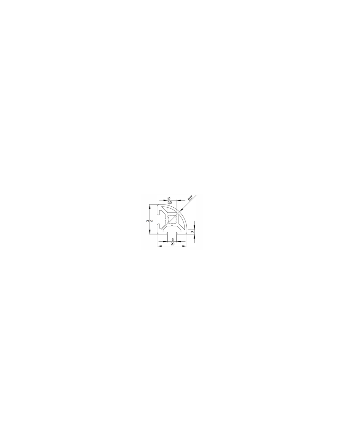 Aluminium profile 20x20R 1/4 round, 2 slots of 6 mm.